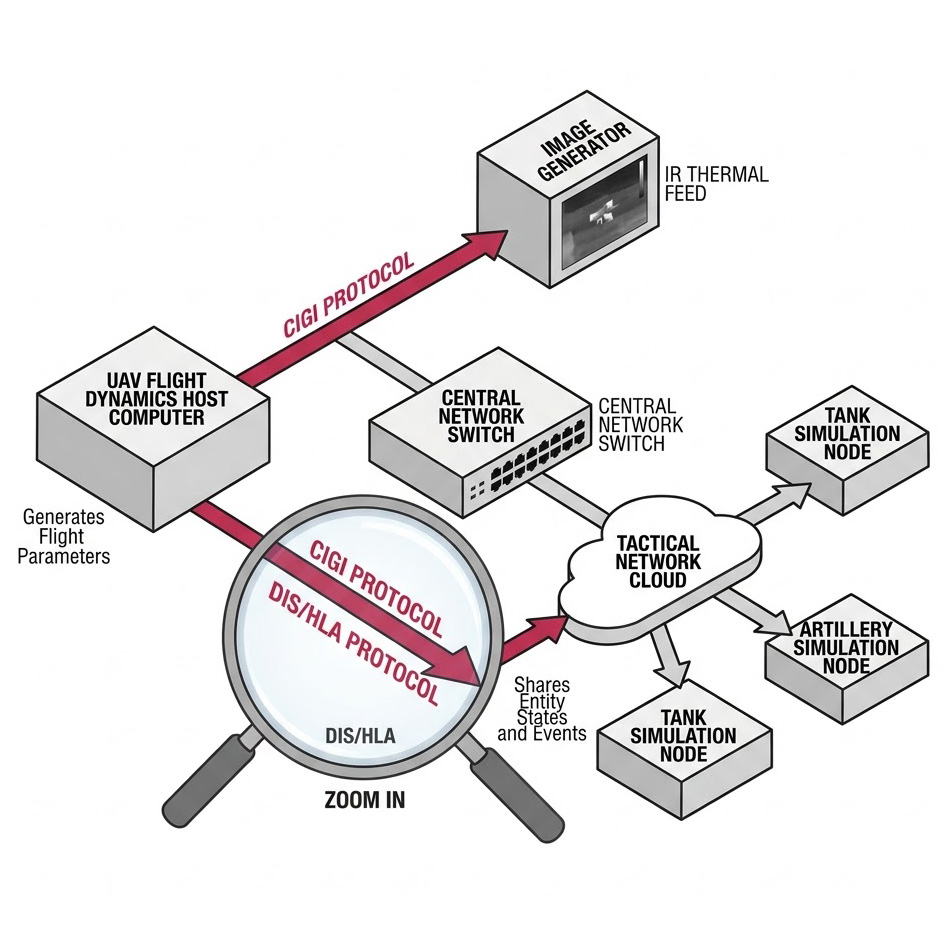 從現有測試與訓練技術的邊界來看,傳統的「孤島式(Standalone)」無人機模擬器面臨著顯著的瓶頸,當酬載操作員在虛擬環境中熟練掌握了紅外線(IR)與微光夜視鏡(NVG)的操作後,他們必須進一步學習如何將這些感測器所獲得的關鍵戰場資訊,在充滿通訊干擾與時間壓力的情況下,即時傳遞給網路中的其他友軍單位;要在實驗室或訓練中心內重現這種跨單位的資訊流動,必須解決一個核心工程難題:如何讓來自不同製造商、運行不同底層邏輯的海、陸、空模擬系統,在同一個虛擬時空中進行無延遲的「對話」,並確保無人機的高精度夜視鏡頭能夠即時渲染出其他系統所觸發的動態事件(例如遠處火砲的爆炸熱源)。