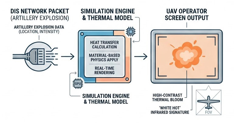 網路通訊的最終目的是為了視覺與感測器的擬真呈現,當 DIS/HLA 網路傳來一個「敵方戰車引擎啟動」或「發射熱焰彈(Flare)」的資料封包時,無人機端的影像產生器必須能即時解譯並渲染,結合 ViXsen 物理感測器模擬模組,系統並非只是簡單地在畫面上貼上一張圖片,而是根據網路傳來的事件狀態,結合 1D 熱傳導運算,即時增加該戰車引擎部位的熱容量與發射率(Emittance),因此,無人機酬載操作員在黑熱(Black Hot)或白熱(White Hot)監控畫面上,會看到引擎隨時間推移而逐漸變亮的真實物理漸變過程,這種將網路資料封包轉化為物理級光電(EO)與紅外線(IR)像素渲染的技術,是Quantum3D在高階感測器模擬中最具區別性的優勢。