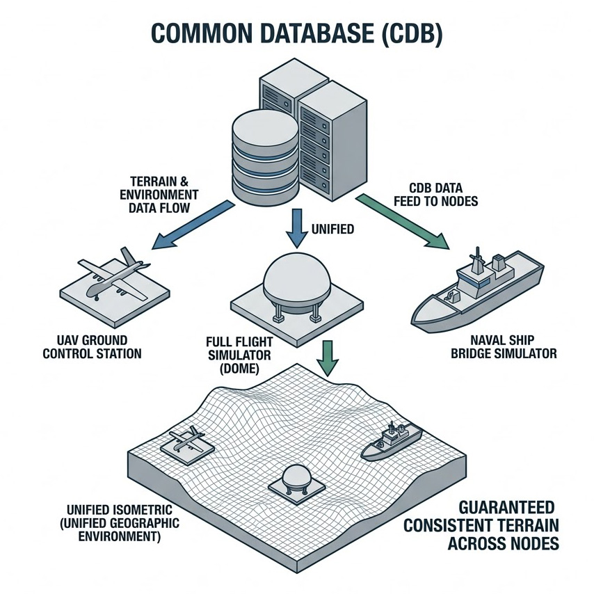 在網路聯合演練中,一個常見的致命錯誤是各個模擬節點使用了微小差異的地形檔案,導致無人機在空中看到的目標位置,與地面戰車感知的位置產生偏差,Quantum3D 解決方案原生支援 CDB(Common Database,通用資料庫) 格式;CDB 是一種開放式的航空與軍事模擬標準化資料庫格式,透過 CDB,無人機模擬系統、地面控制站、以及其他連網的第三方模擬器,都能夠在執行時間(Run-time)讀取絕對一致的地形幾何、建築物配置與材質編碼(Material Coded Data),這確保了當敵方車輛隱蔽於特定樹林時,不論是透過無人機的長波紅外線(LWIR)俯視,或是地面步兵的夜視鏡平視,該樹林提供的物理遮蔽與熱輻射遮擋效果是完全精確且同步的。