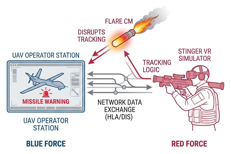 對於執行低空情報蒐集的雲下自主無人機(如 QUAV),敵方攜帶式防空系統(MANPADS)是最大的威脅之一,在分散式模擬網路中,一組學員可以操作 UAV 模擬器,而另一組學員則配備 刺針飛彈模擬器(Stinger Simulator) 扮演敵對防空單位,當 UAV 進入城市作戰區域時,刺針飛彈模擬器操作員試圖透過紅外線尋標器鎖定無人機的引擎熱源。此鎖定訊號透過網路傳遞給 UAV 系統,觸發 UAV 的飛彈警告接收器(MWR),UAV 飛行員必須迅速做出戰術決策,如進行極端的規避機動,或釋放虛擬誘餌彈(Flare)以干擾刺針飛彈的紅外線追蹤;這種由真人操控雙方節點的「紅藍軍對抗(Red vs. Blue)」,能產生遠比對抗預設 AI 更真實的操作壓力與學習效益。