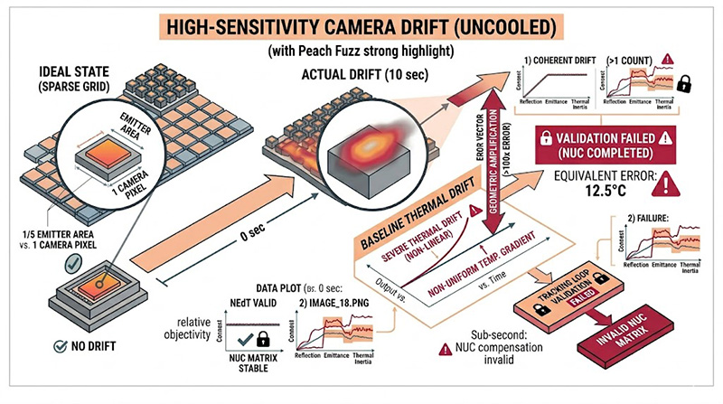 與傳統的冷卻型紅外線相機不同,微測輻射熱計缺乏真空與極低溫環境的保護,其感測器溫度會隨時間產生劇烈變化,導致背景基準極不穩定,在進行高精度的「稀疏網格 (Sparse Grid)」量測時,發射像素通常只佔相機像素的一小部分(例如發射器面積僅佔相機像素的 1/5);這種幾何比例會將相機的熱漂移誤差放大超過 100 倍,實測數據顯示,即使在短短 10 秒的測試區間內,相機也會出現超過 1 個數位計數 (Count) 的同調性熱漂移;若換算為真實目標的等效誤差,在發射器端將產生高達 12.5°C 的嚴重偏差。如果不加以抑制,這種時間熱漂移將徹底摧毀 NUC 校正矩陣的客觀性。