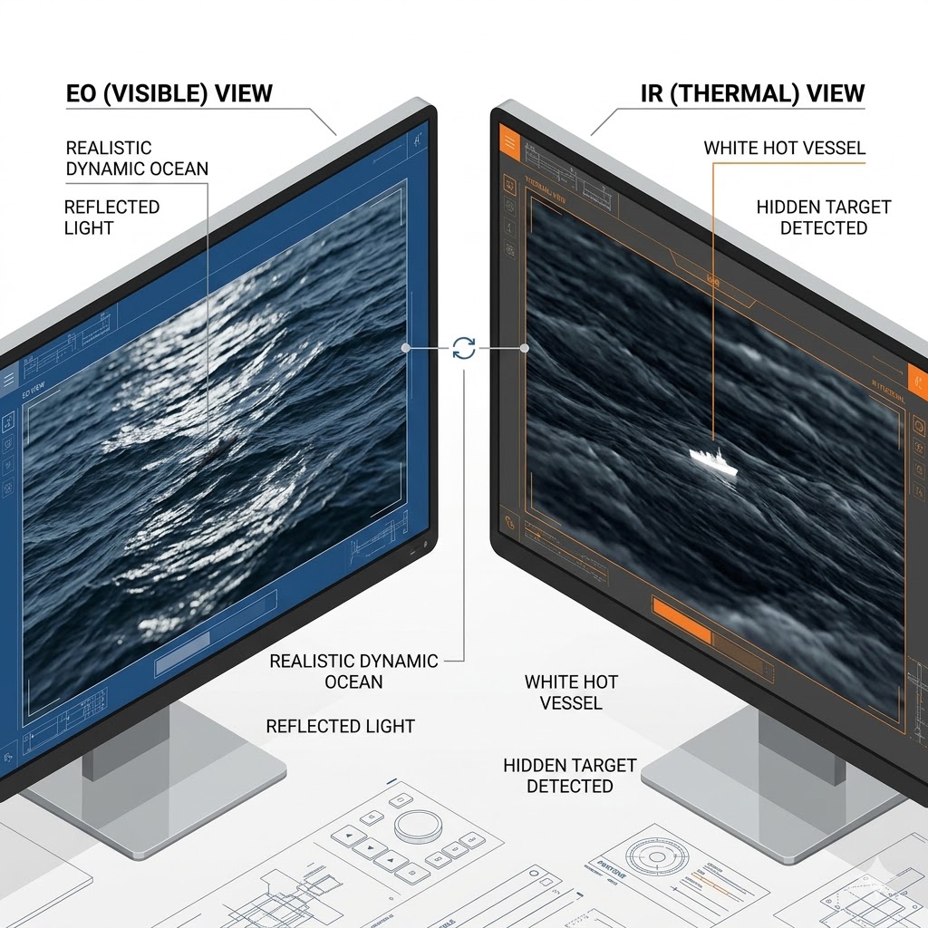 走私與非法越境活動經常利用夜間與惡劣氣候作為掩護,採用低矮的玻璃纖維快艇(Go-Fast Boats)以躲避雷達偵測。由於船體材質對雷達波的反射極低,紅外線感測器成為鎖定這類目標的最佳利器。 在模擬演練中,教官可於 GeoScapeSE 的高解析度海岸線資料庫中佈署多艘由 AI 驅動的非法快艇。即使快艇本身實施了燈光管制與偽裝,但在高速行駛下,Advanced Ocean 模組會自動生成龐大的船首碎浪(Bow Spray)與長達數百公尺的尾流(Wake)。在 ViXsen 的物理運算下,被螺旋槳強烈攪動的海水會與周圍靜止的海水產生細微但明確的溫度差異。操作員能藉由辨識這條在紅外線畫面中拖曳的「熱痕跡」,在數公里外逆向鎖定走私船隻的精確位置,完成從偵蒐到攔截的戰術前置作業。