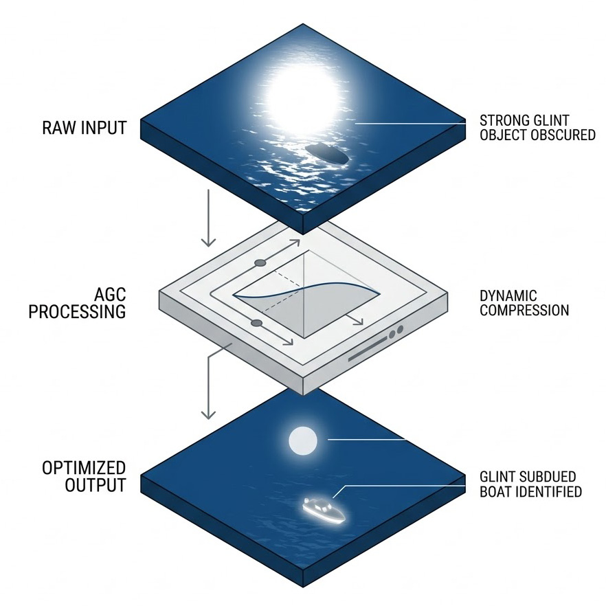 海洋環境對光學與紅外線設備的干擾不僅來自溫度,還來自複雜的光源反射,Quest2 模組負責模擬這些感測器硬體極限,當夜間海浪反射月光,或是遠處港口的城市光暈(City Glow)進入鏡頭時,Quest2 會模擬紅外線感測器的高動態範圍(HDR)運作,並觸發 自動增益控制(AGC, Automatic Gain Control。若月光反射過於強烈,AGC 會自動調暗整體畫面以防止過曝,這可能導致原本微弱的目標熱源暫時消失,Quest2 同時支援隨機雜訊、固定雜訊與閃爍(Scintillation)效果的注入,訓練操作員在這些動態干擾下,手動介入調整亮度與對比度(Level and Gain),以維持目標的清晰度。