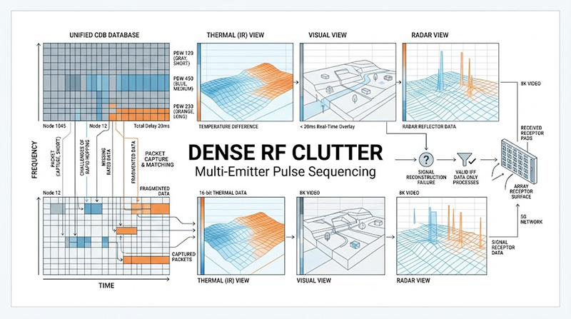 在真實戰場中,UAV 的雷達警告接收器(RWR)會同時接收到來自數十部民用導航雷達、通訊基地台與敵方多模式雷達的訊號,敵方先進雷達採用低被截獲率(LPI)技術、複雜的脈衝內調變(MOP,如線性調頻)與捷變頻(Frequency Hopping)機制,其脈衝重複頻率(PRF)可高達數十至數百 kHz,工程師在實驗室內面臨的極大挑戰在於:模擬器必須能在每秒內解算並串流數以百萬計的「脈衝描述字(Pulse Descriptor Words, PDW)」,並同時處理這些多重發射源(Multi-Emitter)訊號的時間交錯(Interleaving)、脈衝重疊(Pulse-on-Pulse)以及訊號丟失(Pulse Dropping)現象,若系統的數位訊號處理(DSP)頻寬不足,將無法真實還原擁擠頻譜對 RWR 造成的感測器飽和與運算負載效應。