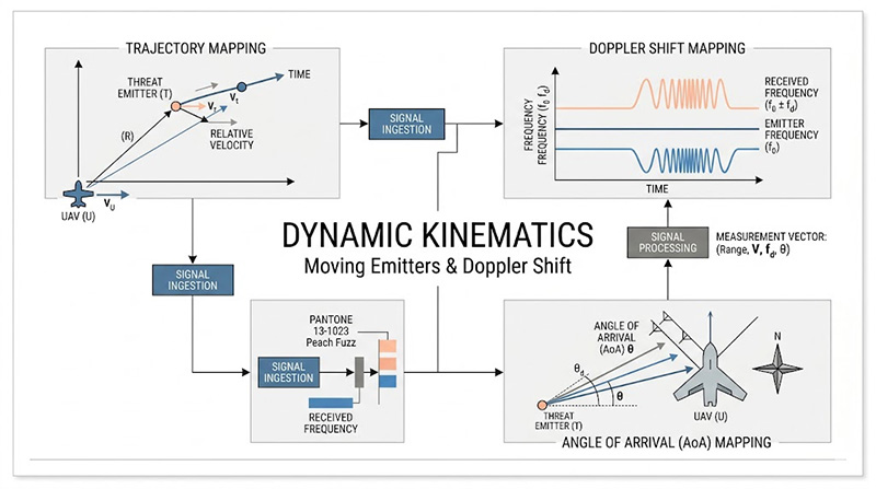 無人機與敵方飛彈/戰機之間存在著極高的相對速度,在進行 HIL 驗證時,測試系統不能僅發射靜態的射頻訊號,必須將「移動發射源(Moving Emitters)」與「移動接收端(Moving Receivers)」的真實 3D 空間軌跡導入模擬中,當載具以高 G 力進行規避動作時,空間幾何的劇烈改變會導致到達角(Angle of Arrival, AoA)、路徑衰減(Path Loss)以及都卜勒頻移(Doppler Shift)產生高度非線性的連續變化,最大的痛點在於,如何確保測試儀器能以微秒級的更新率,無延遲地將外部飛行模擬器傳來的 6-DOF 座標動態轉換為準確的射頻相位與振幅變化,否則將導致 RWR 的測向演算法產生空間失真。