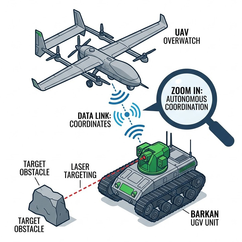 透過結合 DIS/HLA 軍事網路協定,這套系統能將地面的 砲兵前線觀測員訓練模擬器(AFOS) 或是 BARKAN 無人地面載具(UGV),與空中的 UAV 模擬訓練系統 無縫連線,地面單位在虛擬世界中發射雷射,空中的無人機操作員則透過逼真的 NVG 畫面進行辨識與鎖定,這種從「孤島式設備」走向「全域網路共振」的模擬技術,不僅讓工程研發團隊得以在硬體迴路(HIL)中驗證新型感測器的極限,更讓前線官兵能在無風險的環境下,深度鍛鍊空地協同的戰術默契與決策精準度,確立了高擬真雷射模擬在現代聯合作戰訓練中的基石地位。