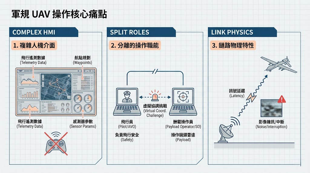 消費級空拍機與軍規/工業級 UAV 的操作有本質區別,軍規 UAV 訓練涉及三個核心痛點: