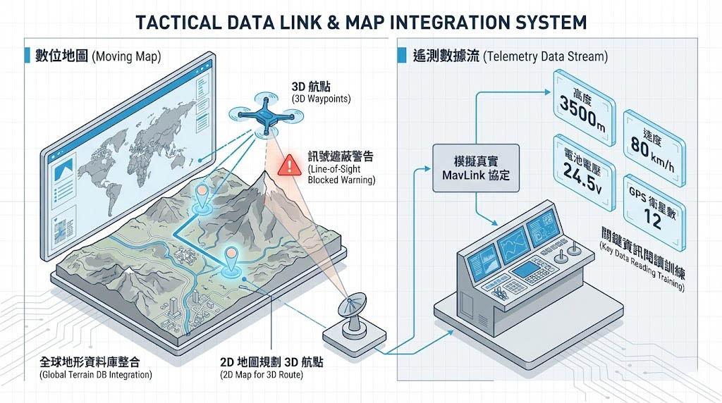 模擬器需整合全球地形資料庫,讓操作員練習在 2D 地圖上規劃 3D 航點,並判斷地形是否會遮蔽訊號(Line-of-Sight Check)。 - 遙測數據流: