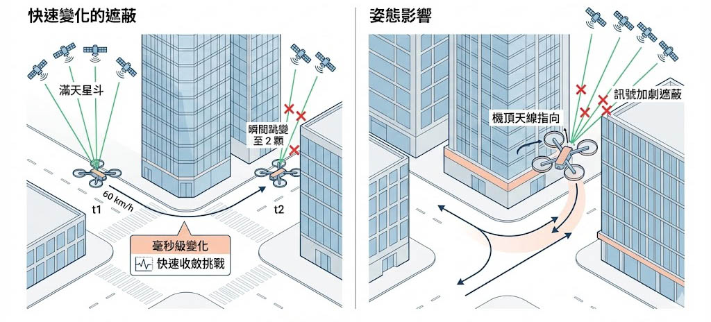 無人機以時速 60 公里飛過街角,衛星的可見性會在毫秒級內發生劇烈變化(從滿天星斗瞬間變成只剩 2 顆),導航濾波器(如卡爾曼濾波)需要極快的收斂速度才能適應這種跳變。