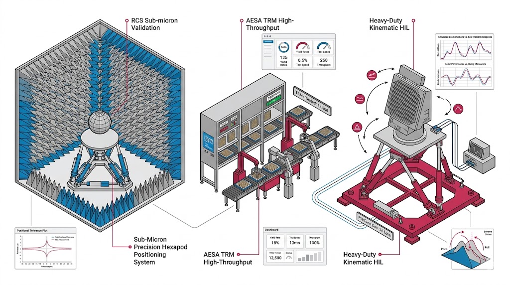 航太國防全域測試示意圖:包含次微米 RCS 量測、AESA 收發模組自動化測試,及重型六軸平台之海用雷達 HIL 極端模擬測試。