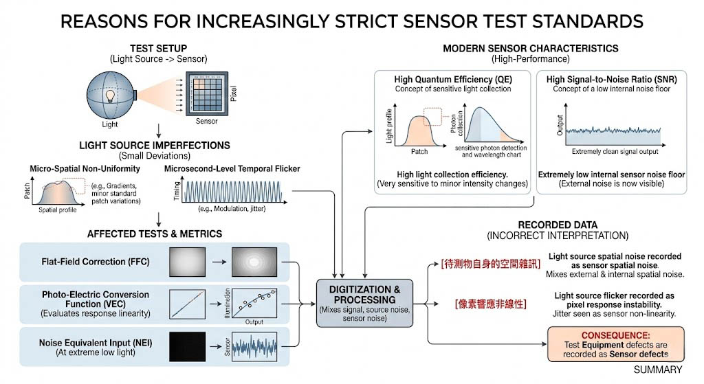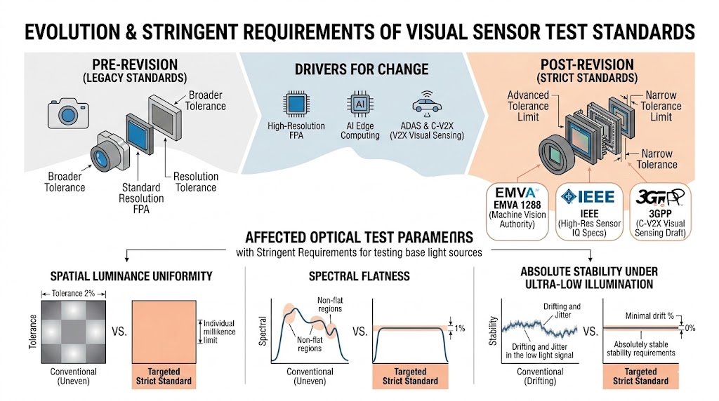 在這樣的技術推力下,國際測試標準與驗證法規經歷了前所未有的嚴格修訂。以機器視覺領域最具權威的 EMVA 1288 標準、IEEE 針對高解析度感測器的影像品質規範,以及 3GPP 在車聯網視覺感測的最新草案為例,這些規範對測試基準光源的「空間輝度均勻性」、「光譜平坦度」以及「極低光照度下的絕對穩定性」提出了近乎苛刻的要求。