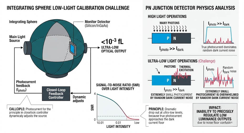 這裡隱藏著一個致命的半導體物理難題:所謂的「暗電流(Dark Current)」。任何處於絕對零度以上的矽基或銦鎵砷探測器,其內部的 PN 介面即使在完全沒有光子入射的「全黑」狀態下,也會因為熱激發效應(Thermal Excitation)而持續產生微小的隨機電流。在強光環境下,光子撞擊產生的龐大光電流會輕易掩蓋這股暗電流雜訊;然而,當積分球被設定在極低光照度時,光學腔體內的光子數量極度稀少,導致探測器所產生的真實光電流,其量級可能與熱激發的暗電流不相上下,甚至被暗電流所淹沒。