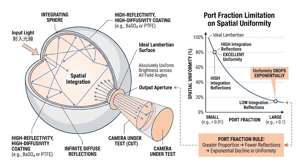 然而,為了讓光線輸出以照射待測相機,積分球必須「開孔」。這個開孔破壞了球體內壁的完美幾何連續性。光學物理中存在一個「開孔率(Port Fraction)」的限制法則:輸出孔徑的面積與積分球總內表面積的比例越大,球腔內的積分反射次數就越少,輸出的空間均勻度就會呈指數級下降。