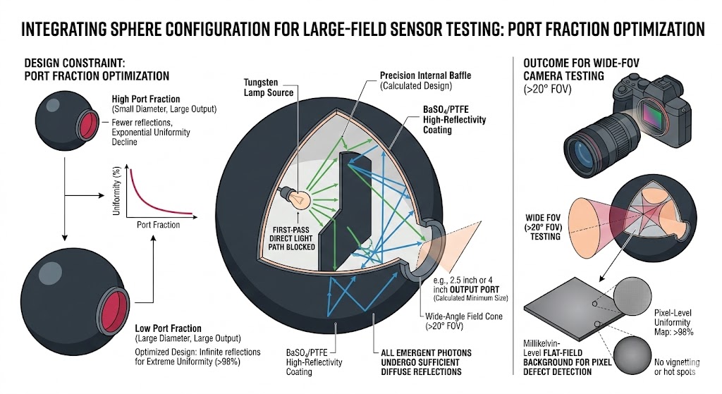 當測試重點在於校正大尺寸 CCD/CMOS 陣列的像素均勻性,或是驗證廣角鏡頭的畸變與相對照度時,系統必須配置具備嚴格「開孔率限制」的積分球架構。 在這個配置邏輯中,為了提供高達二十度甚至更廣視場角(FOV)內大於百分之九十八以上的極致均勻度,積分球的內徑尺寸必須以輸出孔徑為基準向上推算。例如,若待測物需要二點五英吋或四英吋的絕對均勻出光孔徑,積分球本體必須具備足夠龐大的腔體空間,並搭配經過精密計算的內部擋板(Baffles)設計,確保來自鎢絲燈的第一道直射光絕對不會直接從輸出孔逸出,所有離開開孔的光子都必須經歷足夠次數的完美漫反射。這能為相機提供一個毫無瑕疵的平場背景,確保任何像素層級的瑕疵都能被精準捕捉。