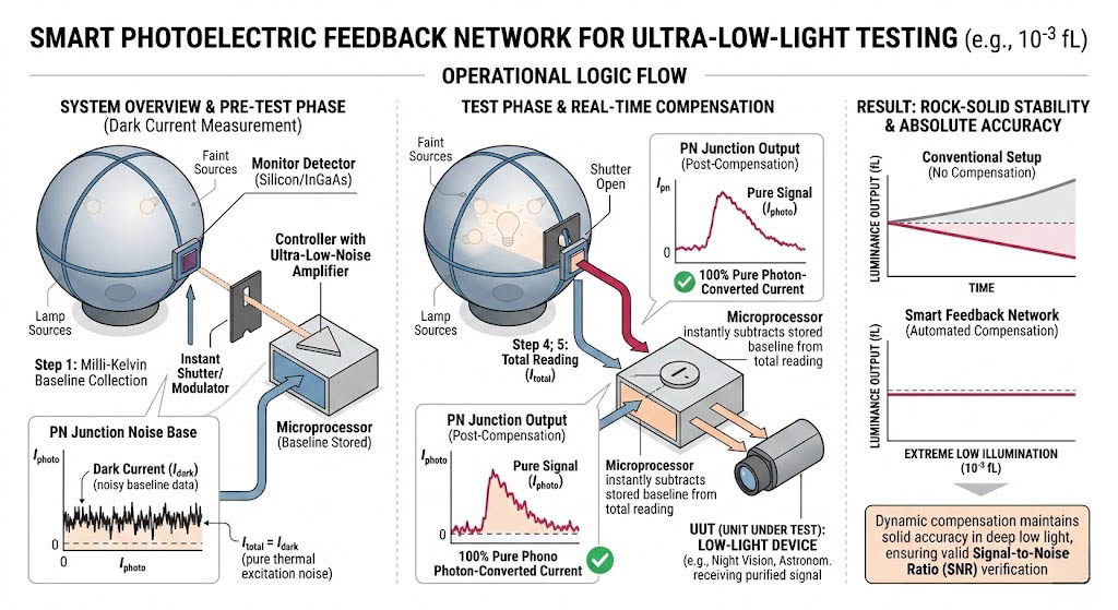 當測試對象是微光夜視設備、高感度天文輻射計,重點在於驗證其在極低照度(如 10⁻³ fL)下的訊號雜訊比時,配置的核心在於「智慧化的光電回饋網路」。 系統必須配置具備極低雜訊前端放大器的控制器,並強制內建「自動暗電流測量與補償(Automated Dark Current Measurement and Compensation)」的軟硬體機制。其運作邏輯是:在每次進行極低光測試前,系統會以極高頻率進行瞬間遮光,測量此時探測器純粹因溫度產生的暗電流基準值,並將此基線數據儲存。當積分球開啟微弱光源時,微處理器會在數位運算層級,即時從總讀數中扣除這個暗電流基線,還原出百分之百純淨的光子轉換電流。這種動態補償架構能確保在深不見底的微光中,亮度輸出的穩定性與絕對準確性依然堅若磐石。