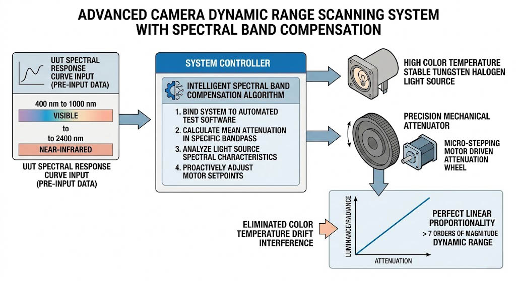 針對需要連續掃描相機動態範圍的測試任務,系統必須配置高色溫穩定的鎢鹵素光源,並結合精密機械衰減器。 為了徹底解決跨頻段測試的衰減問題,高階系統的配置必須包含「智慧型光譜帶補償演算法」。透過將系統與自動化測試軟體綁定,工程師可預先輸入待測物在特定波段(如 400 nm 至 1000 nm 可見光,或延伸至 2400 nm 的近紅外波段)的光譜響應曲線。系統控制器在調整亮度時,會自動計算該特定帶通區域內的平均光衰減與光源頻譜特性,主動調整微步進馬達的設定點,確保在超過七個數量級的動態範圍內,輝度與輻射度數值呈現完美的線性比例,徹底排除色溫漂移的干擾。