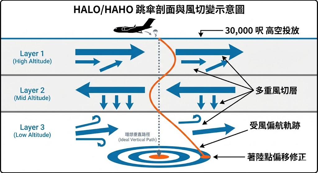 飛機在 30,000 呎遭遇的風是宏觀的;但跳傘員從 30,000 呎降至地面的過程中,會穿越多個風切層(Wind Shear),每一層的風速與風向都不同,直接影響著陸點。 - 身體感官依賴: