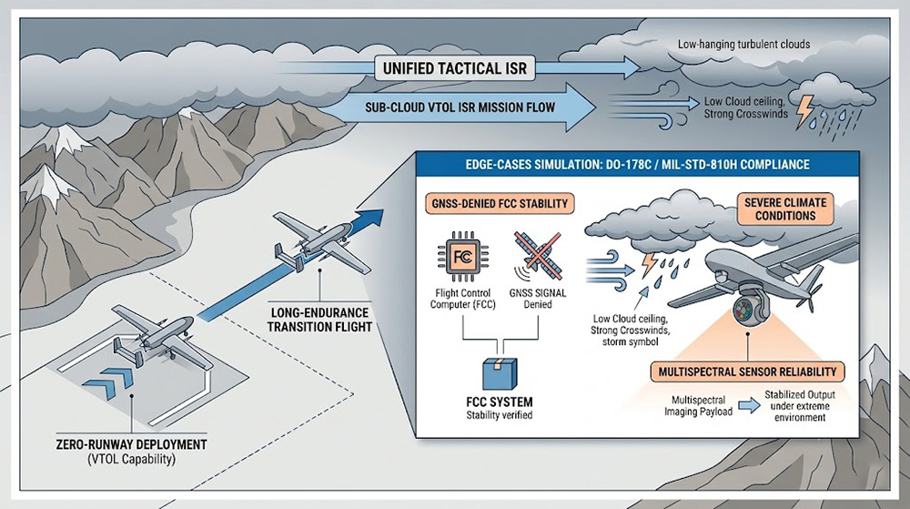 邁入 2026 年針對邊境安全與高強度反恐作戰的戰術需求,無人載具的部署環境已從傳統的平實地貌與備便跑道,轉向極端地形與不可預測的惡劣氣候,具備「雲下(Sub-Cloud)」任務能力與垂直起降(VTOL)構型的固定翼自主無人機,因其兼具旋翼機的零跑道部署靈活性與固定翼的長航時、高酬載特性,已成為戰術情報、監視與偵察(ISR)的核心載體;然而依據最新版航空電子與軍規可靠度標準(如 DO-178C 與 MIL-STD-810H 進階環境規範),要求此類具備高度自主性之飛行器,必須在失去全球導航衛星系統(GNSS-Denied)以及遭遇劇烈氣象變化(如低雲層、強側風、無光照明)的極端邊緣案例(Edge-cases)下,仍能保證飛控電腦(Flight Control Computer, FCC)與多光譜感測器的穩定運作。