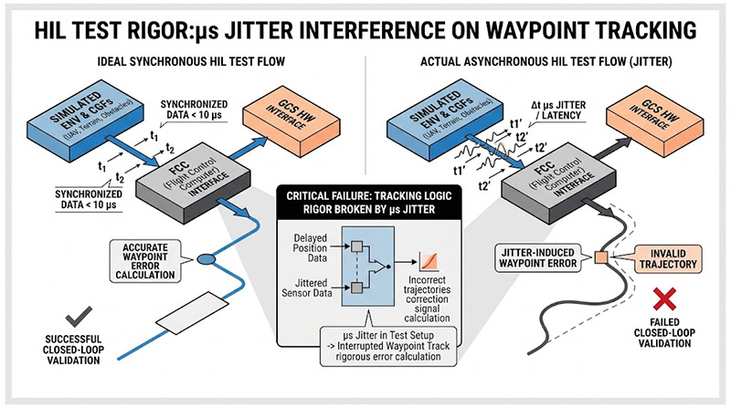 Sub-Cloud 任務經常伴隨地形遮蔽導致的超視距(BVLOS)通訊中斷,測試規範要求無人機在與地面控制站(GCS)失去連線時,必須無縫切換至自主導航、威脅規避並執行自動返航(RTH),在 HIL 測試架構中,要同步模擬複雜的戰術合成環境(包含地面移動目標與動態障礙物)並與真實的 GCS 硬體對接,經常會面臨網路封包延遲與畫面幀數掉幀(Jitter),只要發生微秒級的非同步,即會干擾航點追蹤(Waypoint Tracking)誤差值的計算,徹底破壞閉環系統的測試嚴謹性。