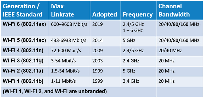 圖 1:Wi-Fi 各代標準及其對應的通道頻寬。
