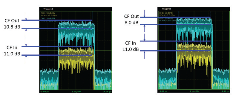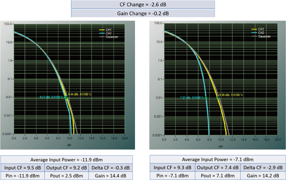 在左側的初始圖表中,兩個波峰因數非常接近,這表示了元件的線性運作狀態;然而,在右側的結果圖表中,將輸入至放大器的功率提高後,導致波峰因數之間出現明顯差異,這即表示了元件的非線性特徵。