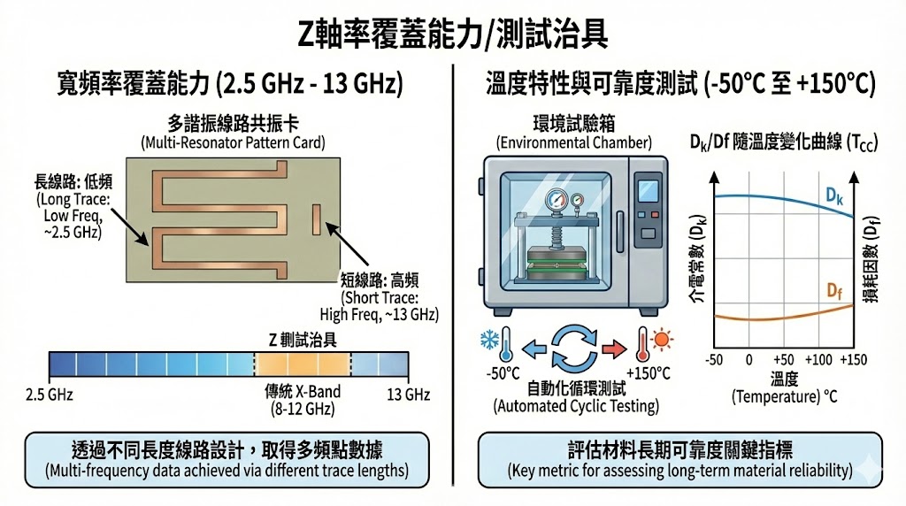 雖然此標準名稱中有 "X-Band" (8-12 GHz),但現代的治具設計已能支援更寬的頻率範圍,一般來說,透過設計不同長度的共振線路,可以在 2.5 GHz 至 13 GHz 之間取得多個頻率點的數據;此外 Z 軸特性的溫度穩定性至關重要,車用雷達或 5G 基地台在運作時溫度極高,材料在 Z 軸方向的熱膨脹係數 (CTE) 通常最大;專業的 Z 軸治具採用耐高溫金屬與線材設計,能放入環境試驗箱中,進行 -50°C 至 +150°C 的自動化循環測試,協助工程師繪製出 Dk/Df 隨溫度變化的曲線 (Tcc),這是評估材料長期可靠度的關鍵指標。