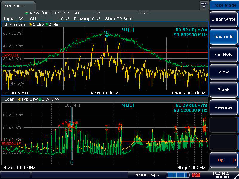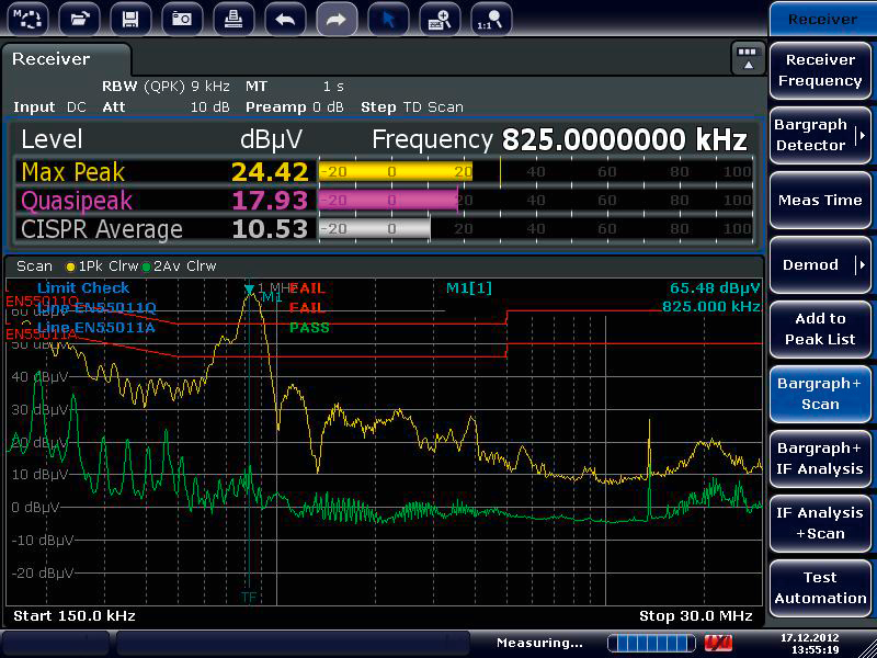 R&S ESRP 能在數秒內完成帶有準峰值與平均值加權的干擾電壓量測。