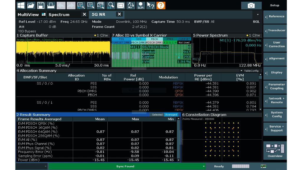 R&S FSW‑K144 和 R&S FSW‑K145 選配涵蓋符合 3GPP 5G NR 第 15 版和 16 版 (R&S FSW-K148) 以及 17 版 (R&S FSW-K171) 標準的 3GPP 5G NR 下行和上行帶內量測 (In-band Analysis),分析每個訊號子訊框並提供廣泛的量測結果,包括 EVM、不同通道和訊號的頻率和功率。