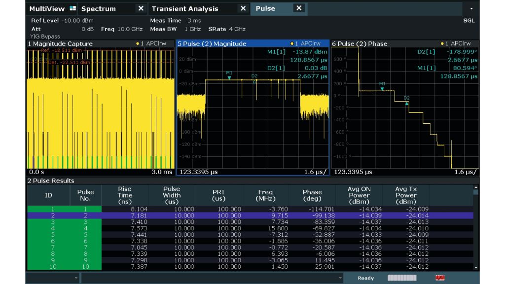 R&S FSW‑K6 脈衝量測應用只需輕觸按鈕即可量測所有相關脈衝參數,例如:脈衝持續時間、脈衝週期、脈衝上升和下降時間、脈衝內的功率下降以及脈衝內相位調變,它能提供跨越多個脈衝的趨勢分析,使用者可選擇同時在螢幕上顯示哪些結果,R&S FSW 可以在幾秒內提供雷達系統的全貌;分段 I/Q 擷取功能確保 I/Q 數據僅在偵測到脈衝時才帶有時間標記並儲存到記憶體中,對於脈衝長度小於 1 μs 且脈衝重複間隔 (PRI) 為 1 kHz 的情況,此功能顯著增加了分析週期,可達到近 1000 倍的倍數,憑藉高達 8.3 GHz 的內部分析頻寬,R&S FSW 可支援超寬頻雷達的設計。