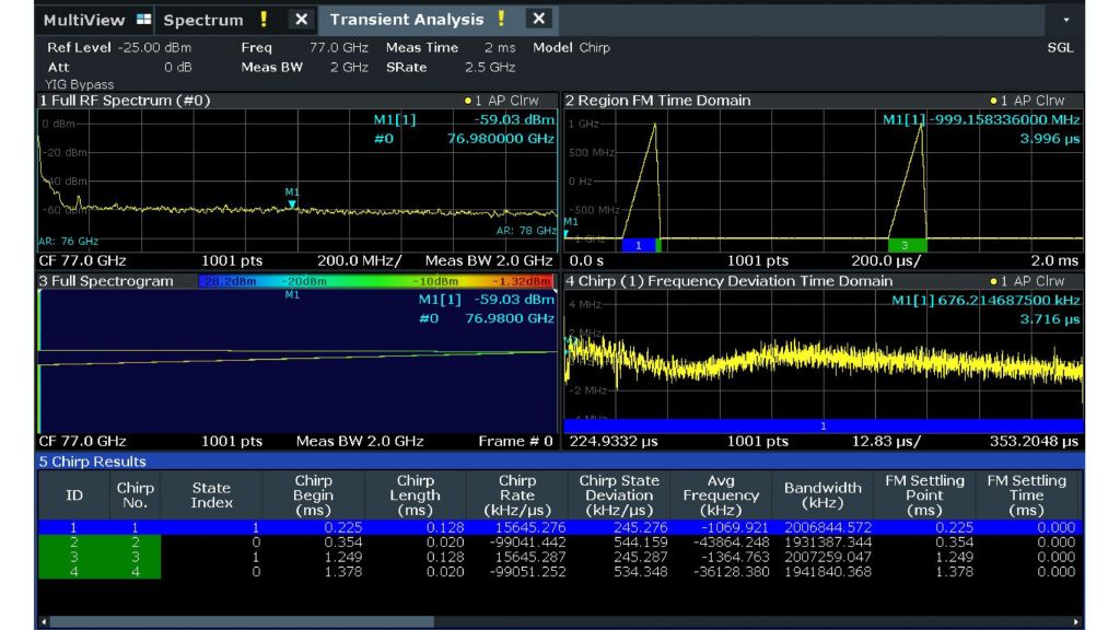 R&S FSW‑K60/‑K60C 瞬態分析/線性調頻量測選配對用於汽車雷達感測器的 FMCW 訊號進行特性分析。