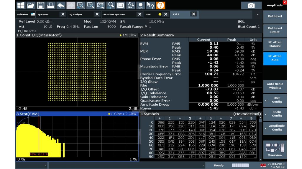 1024QAM 調變訊號的分析:星座圖、結果表、符號表和 EVM 分佈