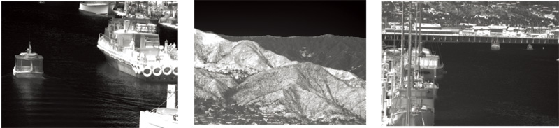 左右兩側分別展示了航行中與停泊於碼頭的船隻,中間則呈現了起伏的山脈地形,畫面高對比度地展現了該短波紅外線攝影機在不同戶外環境下的清晰觀測能力。