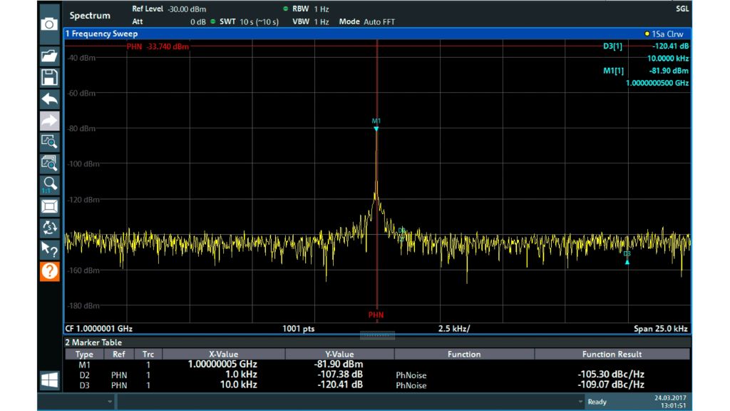 1 GHz 載波、10 kHz 偏移時 –108 dBc (1 Hz) 的低相位雜訊,有利於頻譜量測,它能實現窄頻載波的準確鄰道功率量測 (ACPR),並能偵測載波附近不必要的雜散。