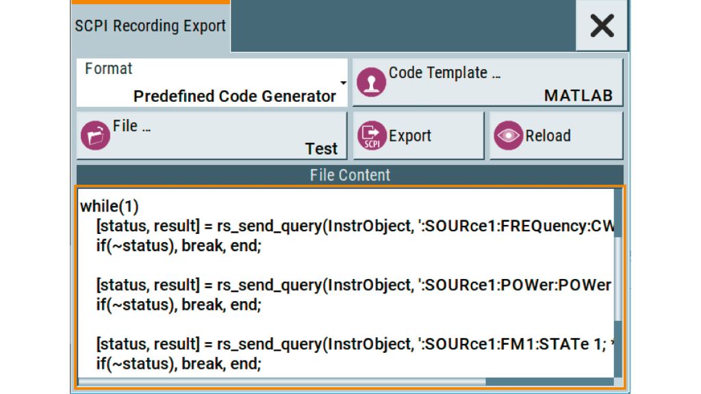 除了提供 SCPI 命令本身外,R&S SMA100B 還提供了帶有程式碼產生器的 SCPI 巨集錄製器 (macro recorder),可以自動記錄手動設定並建立一個可執行的 MATLAB 腳本。