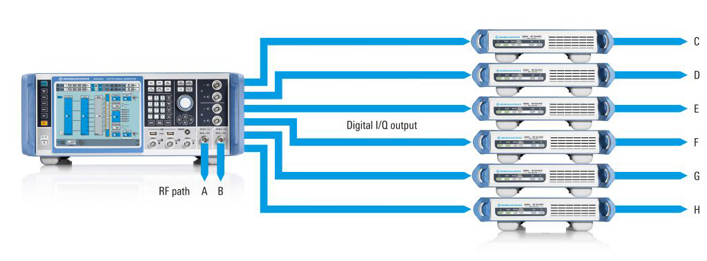 具備 8 個 RF 輸出的 4x8 MIMO 配置 — 由一台雙路徑 R&S®SMW200A 搭配六台 R&S®SGT100A 訊號產生器模組組成,並由 R&S®SMW200A 進行操作。