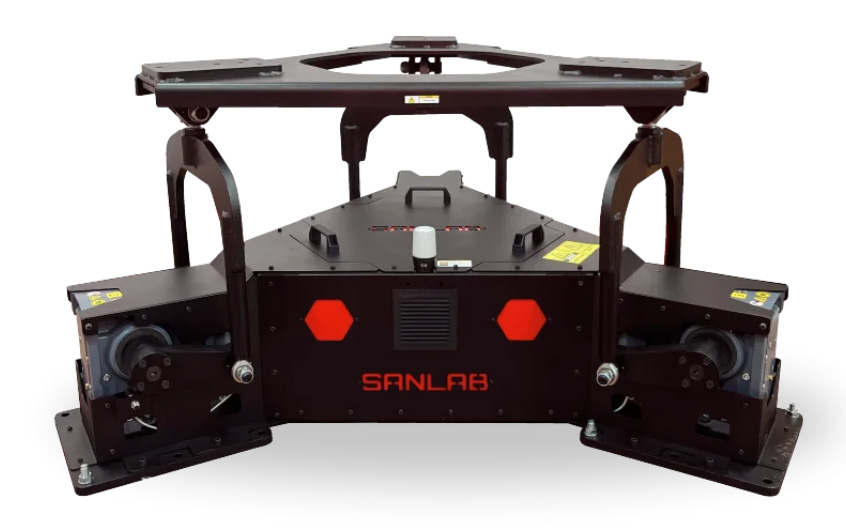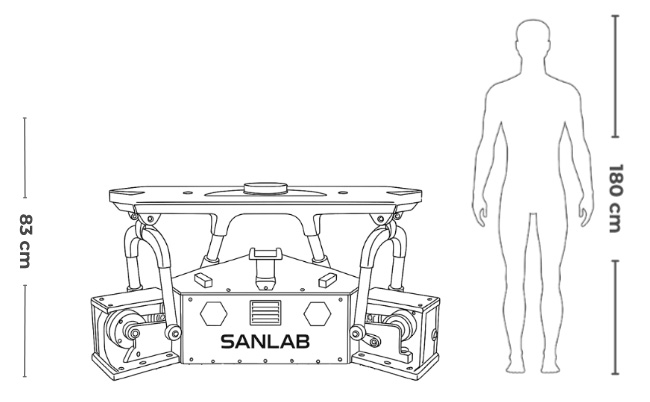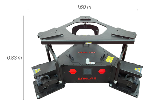 該平台結構緊湊(L1.79×W1.56×H0.83m),且具備出色的動態性能,特別是在角加速度方面(俯仰軸高達 ± 488 °/s²),它透過三個伺服驅動致動器提供最關鍵的運動軸,適用於模擬車輛和飛行器的轉彎傾斜感和垂直升降感。